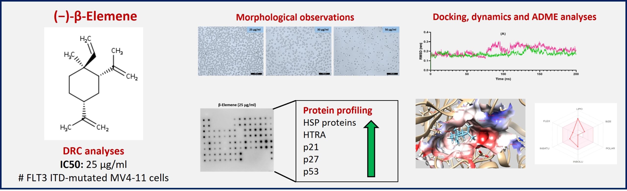 RESULTS: β-Elemene exhibited cytotoxic activity against FLT3-mutated MV4-11 and FLT3 wild-type THP-1 cells, with an IC50 of around 25 µg/ml. The molecular studies revealed that β-Elemene inhibited cell proliferation by inducing p53, and the involvement of p21, p27, HTRA, and HSPs were also demonstrated. The interactive inhibition in proliferation was confirmed via molecular docking and dynamics analyses. β-Elemene occupied the FLT3 enzymatic pocket with good stability at the FLT3 active site.