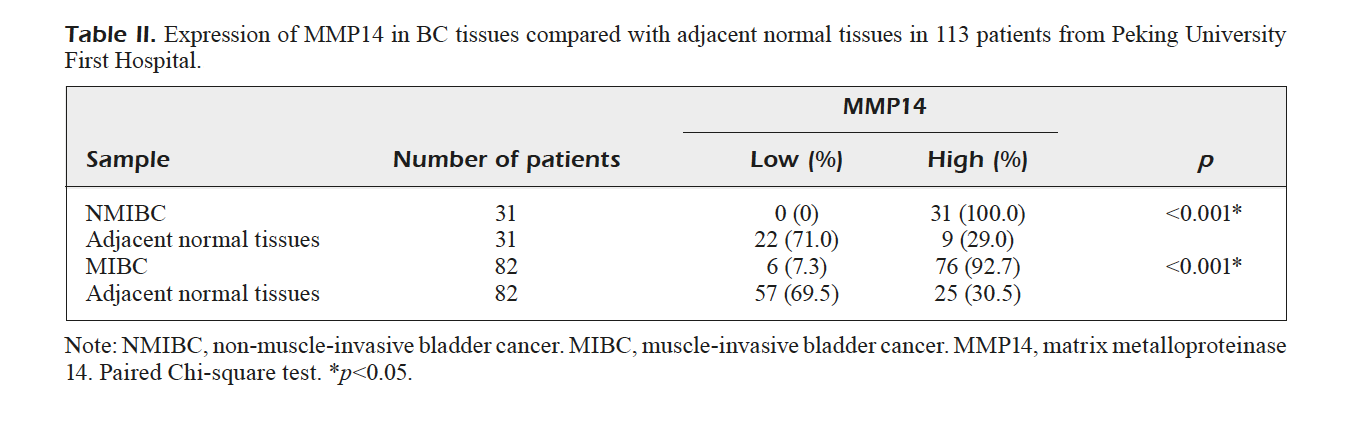 – In Table II, data display in MMP14 expression between Low and high group was inverted. This correction does not involve any statistical data modification and does not affect the conclusion of the article.